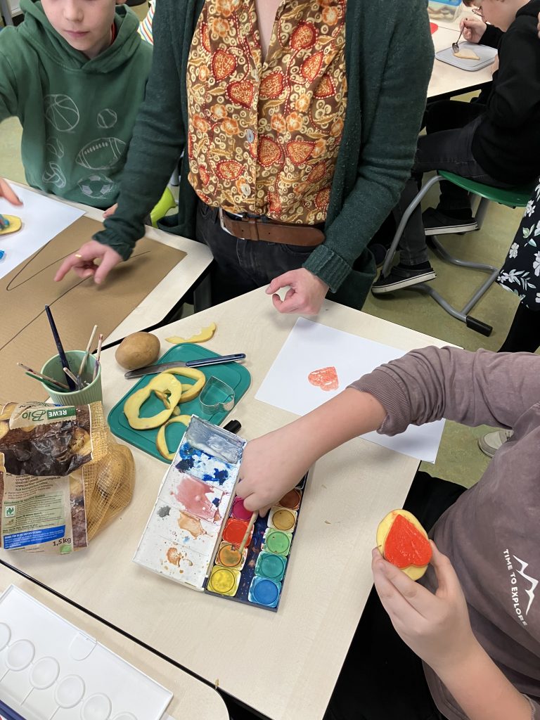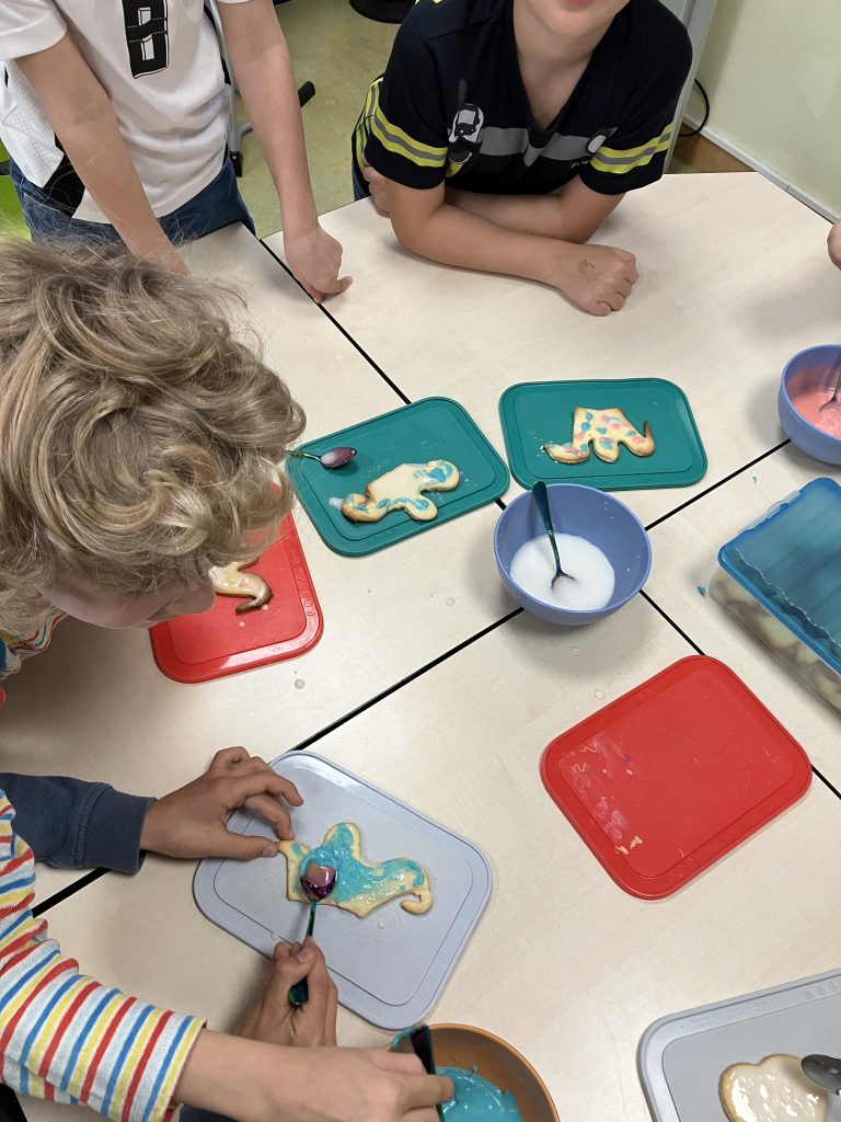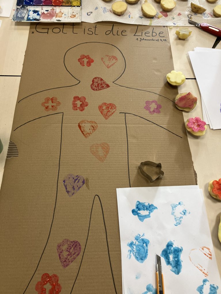 Anschließend durften die Kinder verschiedene Stationen ausprobieren: Beim Plätzchendekorieren haben sie mit buntem Zuckerguss religiöse Kekse (Herzen, Kreuze, Kronen) verziert, was ihnen sichtlich Spaß gemacht hat. Eine weitere Station bestand aus Kartoffeldruck und dem Gestalten eines großen Pappmenschen mit dem Bibelvers „Gott ist Liebe“. Die Kinder haben viele bunte Stempel gesetzt und so ein fröhliches, liebevolles Bild gestaltet. Außerdem gab es eine Ausmal-Station, an der sie ganz ruhig und konzentriert gearbeitet haben.