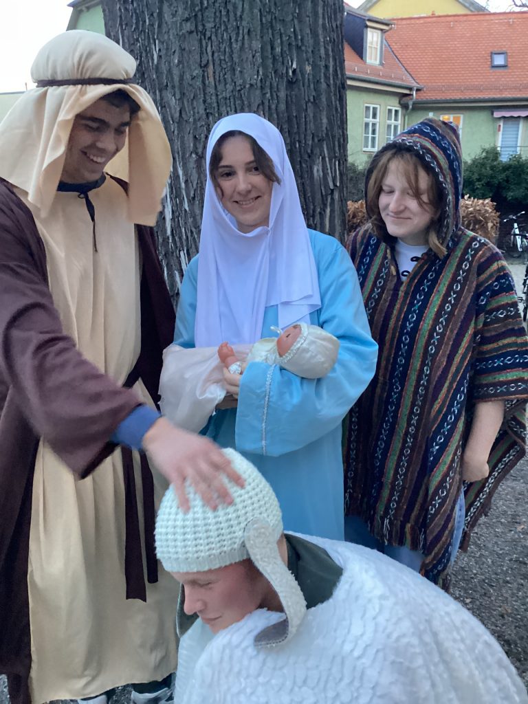 Schon seit dem Jahr 2009 besuchen Schüler/innen des katholischen Religionsunterrichts am Montag vor den Weihnachtsferien das Johannes-Landenberger-Förderzentrum, um die Weihnachtsgeschichte in Erinnerung zu rufen. Im Mittelpunkt steht immer, den Kindern der Nachbarschule eine Freude zu bereiten.